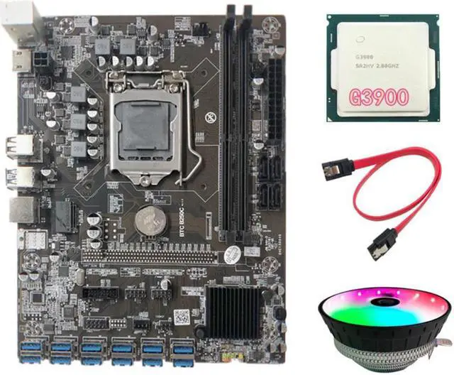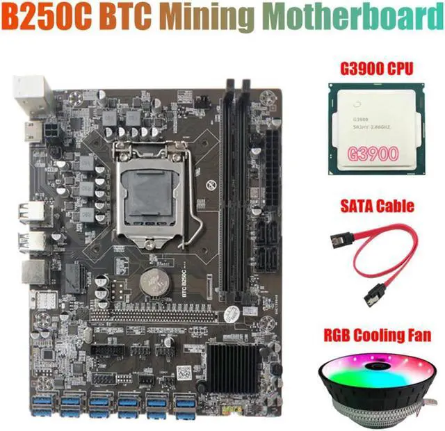 B250C Mining Motherboard with RGB Cooling Fan+G3900 CPU+SATA Cable 12 PCIE to USB3.0 GPU Slot LGA1151 Support DDR4 RAM