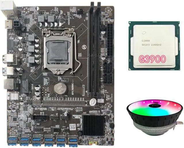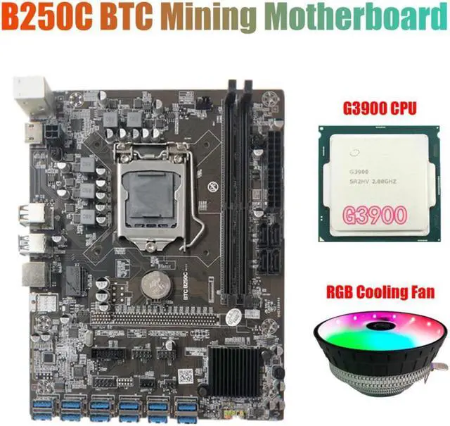 B250C Mining Motherboard with RGB Cooling Fan+G3900 CPU 12 PCIE to USB3.0 GPU Slot LGA1151 Support DDR4 RAM for BTC