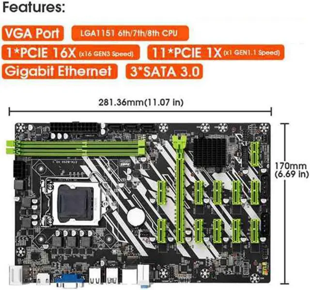 Supports 12 PCIe slots to maximize your mining connection and speed, up to 32GB DDR4 2666MHz RAM, USB3.0 Gigabit LAN