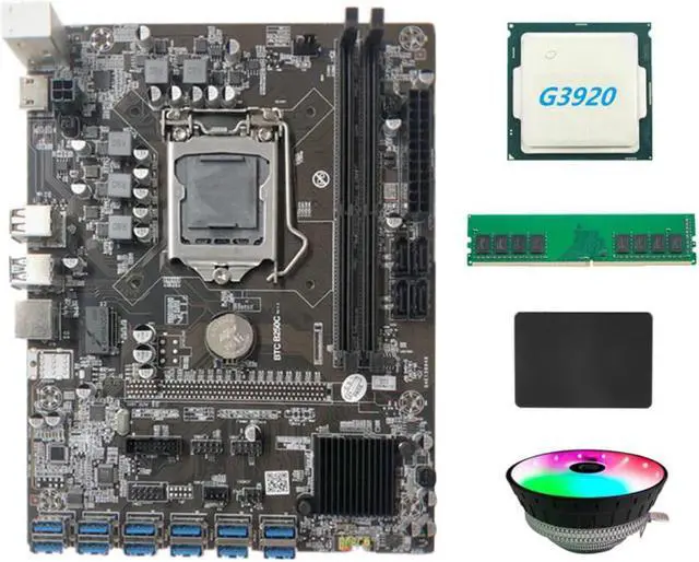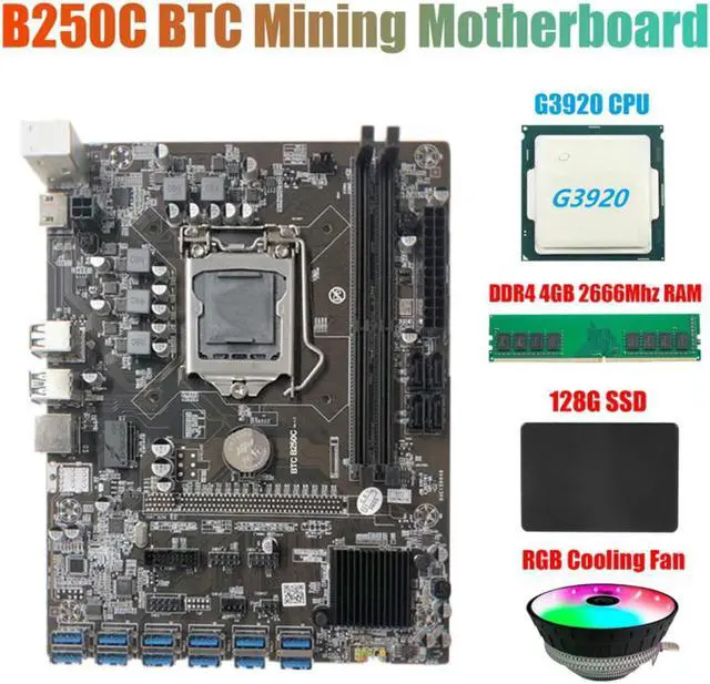 B250C BTC Miner Motherboard+G3920 CPU+RGB Fan+DDR4 4GB 2666Mhz RAM+128G SSD 12XPCIE to USB3.0 Graphics Card Slot
