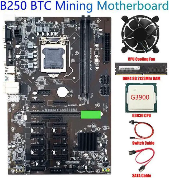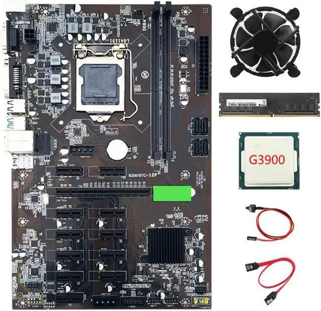 B250 BTC Mining Motherboard 12 PCIE LGA1151 with SATA Cable+ Switch Cable+G3900 CPU +Cooling Fan+DDR4 8GB 2133MHZ RAM