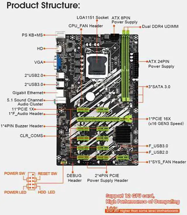 2. Supports 12 PCIe slots to maximize your mining connection and speed, up to 32GB DDR4 2666MHz RAM, USB3.0 Gigabit LAN