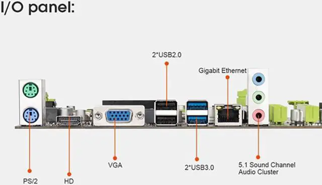 Rear I/O: 2 x USB2.0;1 x RJ45 network port;1 x 5.1 channel audio cluster;1 x PS2 (support PS2 keyboard + mouse);1 x HDMI-compatible port;1 x VGA;2 x USB3.0