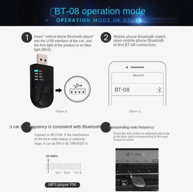 BT-08 car Bluetooth receiver (hands-) is a high-tech wireless product that can receive mobile phones, TF cards or Bluetooth-enabled transmitters. This music player can be output through the 3.5mm standard audio cable AUX, and directly through the car radio (FM) to play music, navigate, and make calls. You can listen to the music from your smart phone and TF card in your home speaker or car audio system. Enjoy non-destructive car music, navigation, and call solutions, and use your smartphone to make calls and enjoy music through the car audio. With just one tap, you can talk hands-, enjoy music or Internet radio stored in the phone/TF card. The product has an embedded echo cancellation microphone, which can easily switch between music and phone calls with just one button.