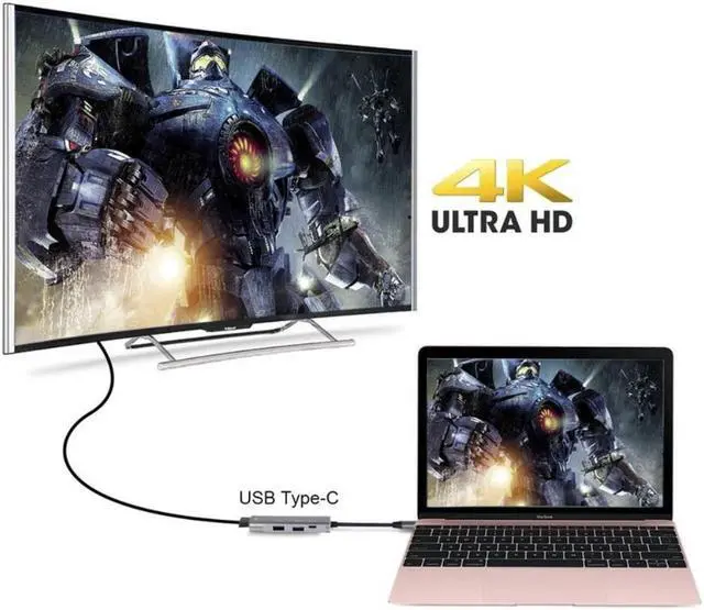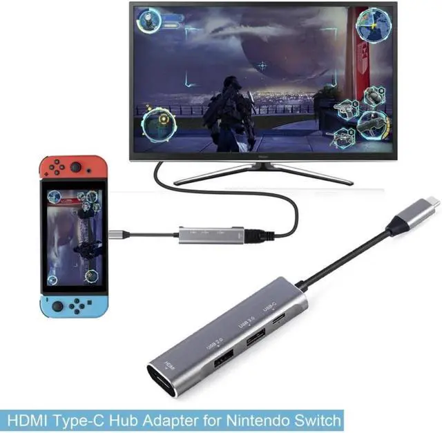 USB-C to HDMI-compatible+ type-C + USB3.0 + USB2.0 is a video transmission adapter cable, the input device has a USB-C interface for mobile phones, tablets, laptops, etc., the USB-C interface is small in size and supports Positive and negative insertion, data transmission, HDMI-compatible output end supports up to 3840X2160P / 30HZ video resolution, output device high-definition display, LCD TV, etc., support Nintendo