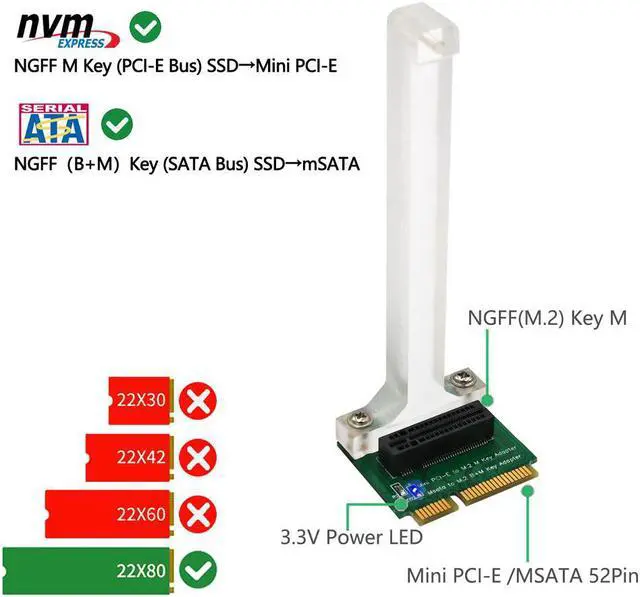 1. When convert to mini PCI-E interface, only support M.2 Socket 3 PCI-e-based M Key 2280 SSD, doesn't support M.2 SATA bus B key SSD, but speed at 1X speed only!