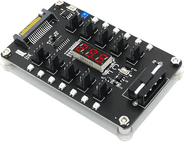 Fan Hub Motherboard 1 to 10pin 3/4Pin Fan to SATA 4Pin PWM Cooler Splitter 12V Power Supply Controller Adapter +LED Temperature