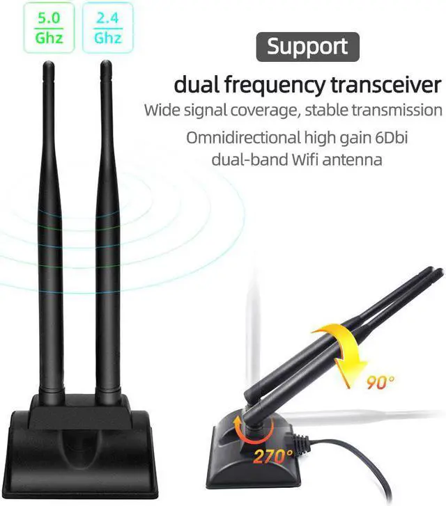 1. Frequency: Dual Band 2.4GHz 5GHz 5.8GHz; Gain: 6dBi; Polarization: Vertical; Orientation: Omnidirectional