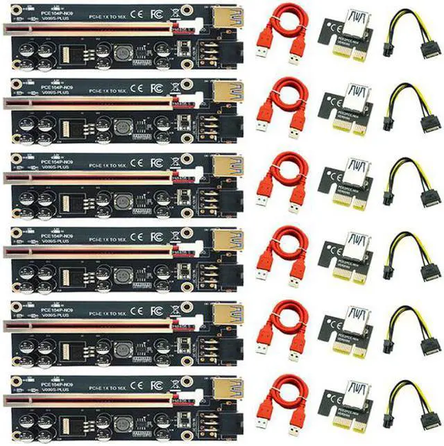 6pcs Mining X1 X16 PCIE Riser 009s Plus LED GPU Riser PCI Express X16 Adapter Molex 6Pin SATA to USB 3.0 Cable for Bitcoin Miner
