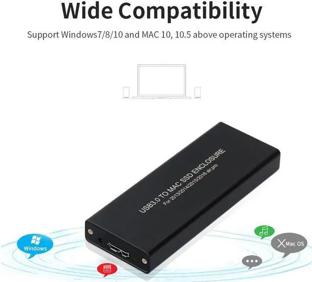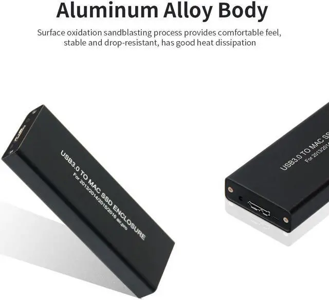 This SSD enclosure adopts USB3.0 interface, supports plug and play and hot plug. The shell is made of aluminum alloy, the surface is oxidized and feels comfortable. It has good compatibility, good stability and fast transmission rate. Suitable for MacBook Air/Pro/Retina 2013, 2014, 2015 and other versions of built-in SSD.