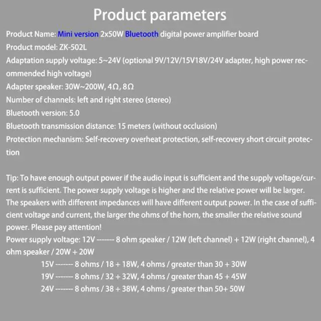 The power supply with the board is critical. The higher the voltage, the higher the current and the better the output power. If you only have 12V 1A, you can bring a 3-4 inch speaker. If you are 19V 5A or above, there is no problem with 8-10 inches, and the power supply must be highly valued. If the voltage is too low, the sound will be distorted after the sound is amplified. If the current is too small, the speaker will pull the voltage low, work abnormally or the sound quality will deteriorate.