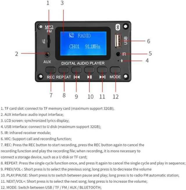 DC5V 12V MP3 Decoder Board WMA Decoding MP3 Player Bluetooth 5.0 Audio Module Support WMA WAV TF USB FM Radio Hands