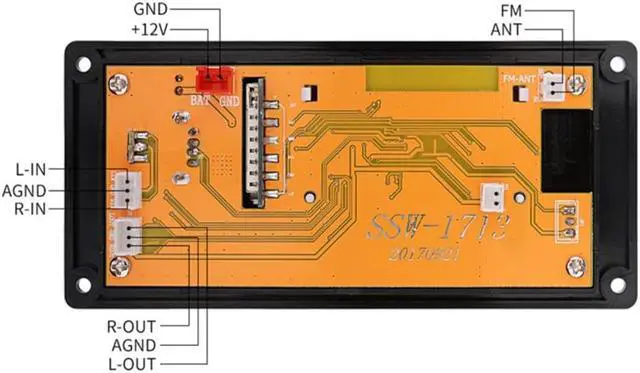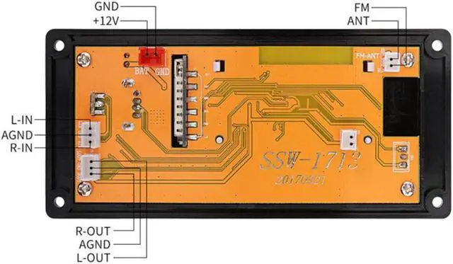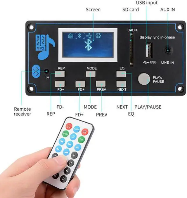 4: Support U disk / SD card playback, support for WAV, MP3, WMA three-format decoding. Supports fast forward and rewind, folder switching, and audio switching.