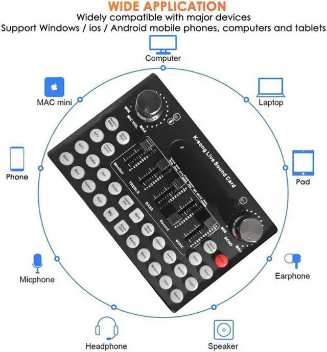 The mini sound card can be used for DJ, music studio recording, condenser microphone, karaoke online, podcast, mic, singing, k song, live stream, TikTok and YouTube streaming, guitar, Facebook, anchor, voice mixing , home audio recorder.