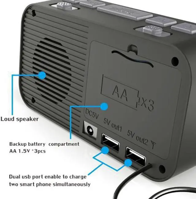 4. Insert the clock with dual USB ports for charging. Use any smartphone charger to power the clock. 3 X AA batteries are required to store settings in the event of a power failure. High-speed dual USB ports can quickly charge your mobile phone, tablet or other smart devices.