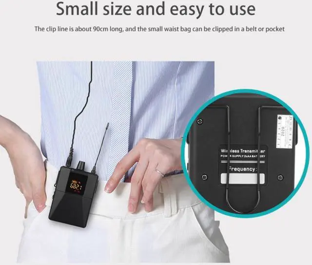 Easy to set up: plug and play, powered by a rechargeable , choose a lapel or headset microphone and plug it into the microphone socket of the transmitter, turn on both, and you can start.
