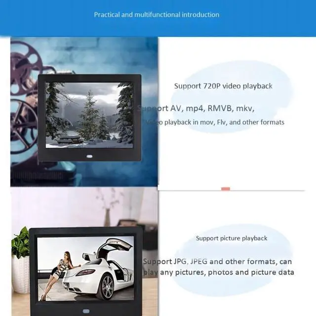 Support 720P video playback, support picture playback. Comes with remote control, you can play photos anytime. You can send photos or small videos to the photo frame anytime, anywhere without creating an account. It also has a micro-USB port and a micro-SD card slot, it is very simple! The wall mountable function allows you to place the frame on the wall as needed. And photos can be automatically rotated.