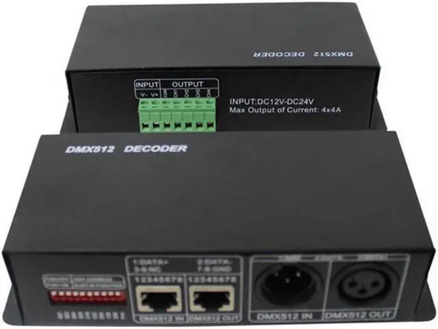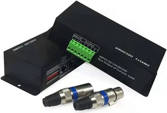 Each DMX common controller occupied 3 DMX address, adopt coding switch set address. The max output power is 144 watts, enable you to connect 20M RGB strips of 150LEDs or 10M RGB strips of 300LEDs.