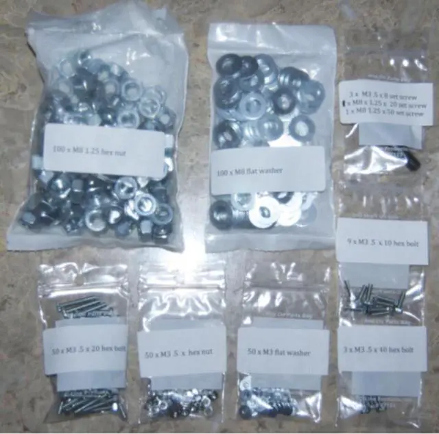 Includes fasteners listed on the Reprap Wiki Bill of Materials for a Prusa Mendel i2.