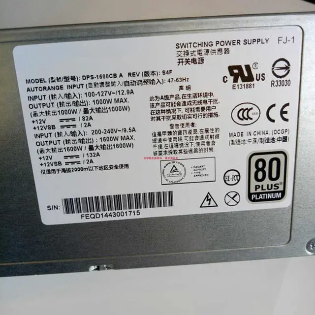 PFC Type:Active Package:Yes Application:Server Model Number:DPS-1600CB A DPS-1600CB B Input Voltage:100V-240V Modular:Full Modular 80 PLUS Certification:80 PLUS PLATINUM Origin:Mainland China Certification:CE,FCC,RoHS,UL