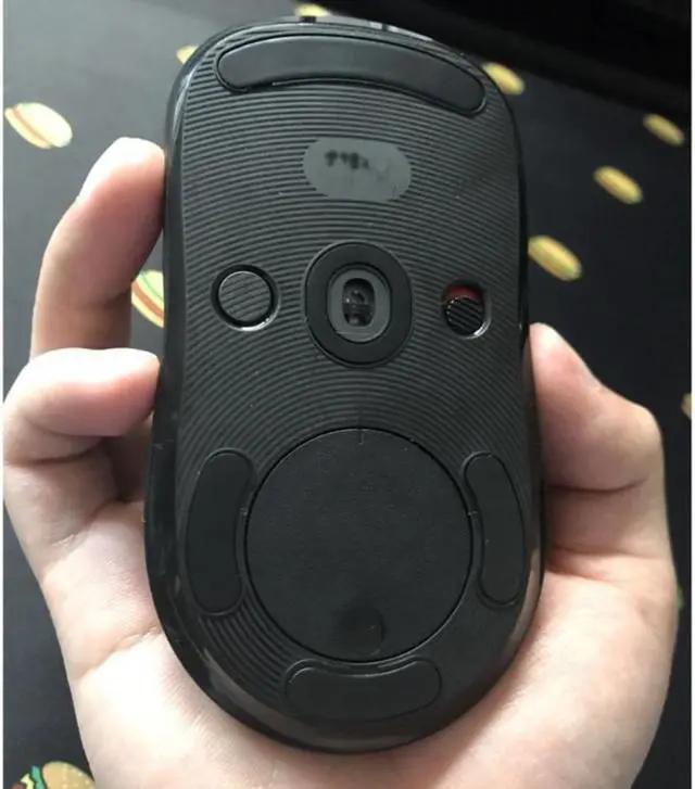 After removing the transparent protective film on the mouse feet, carefully align the feet groove on the mouse bottom shell, then apply slight pressure to fit the foot.