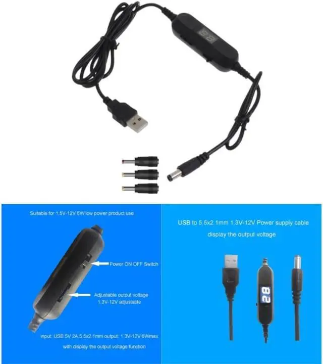 1x USB to 1.3V-12V 5.5x2.1mm Cable with 3 Adapter