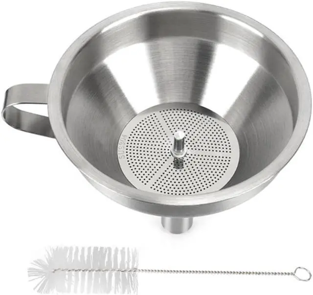 This stainless-steel funnel is easy to store save space, the ergonomic-handle for hangingin kitchen cabinets. Equipped with a cleaning brush. It is easy to clean up after use.
