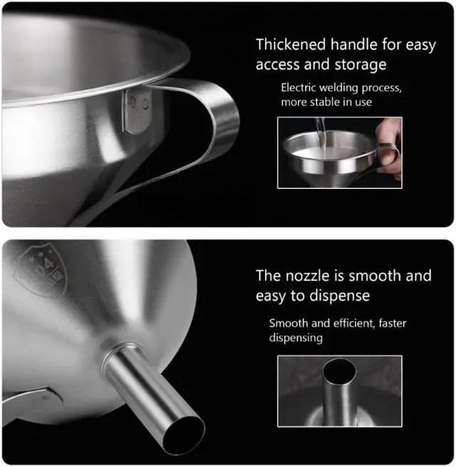 The funnel is made of food grade 304 stainless-steel, with practical handle, for most bottles, jars and other container