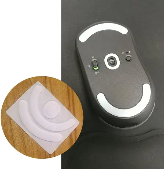 After removing the transparent protective film on the mouse feet, carefully align the feet groove on the mouse bottom shell, then apply slight pressure to fit the foot.