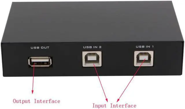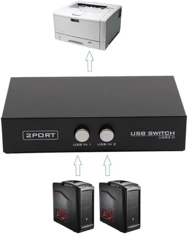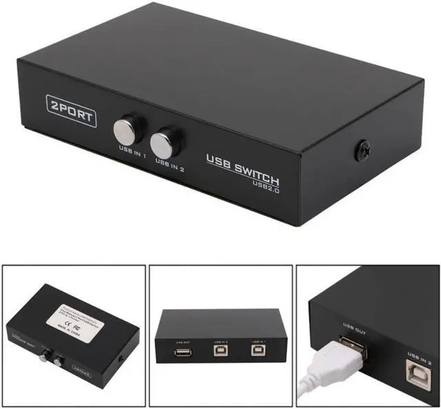and High speed 2 port usb switch No external power required No software installation required Compatible with USB 2.0 Easy and Convenient to use You can share your USB device such as printer or scanner with up to 2 computers Share one USB device between four computers without manually switching out cables Support USB printer, scanner, mouse, keyboard, mobile hard disk, etc Color: Black Size: 11x6.7x2.4cm/4.33x2.64x0.94inch Quantity: 1PC Note: Size for manual measurement, there may be a 0 to 2 cm error, belongs to the normal phenomenon. And due to the difference between different monitors, the picture may not reflect the actual color of the item. Thank you! Package includes: 1Pc x 2 In 1 Out USB Sharing Switch Box(not included USB cables)