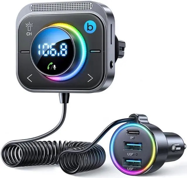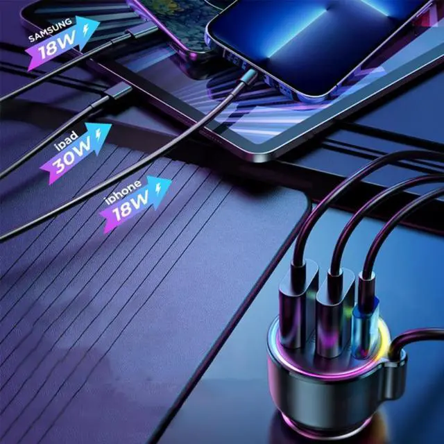 Three Ports Charging&LED Light Design:Car Bluetooth-compatible Adapter can charge three devices simultaneously via one PD 30W Type-C and two QC3.0(18W per) USB charging ports and will auto-assign the best charging efficiency. The PD Port supports fast charging.