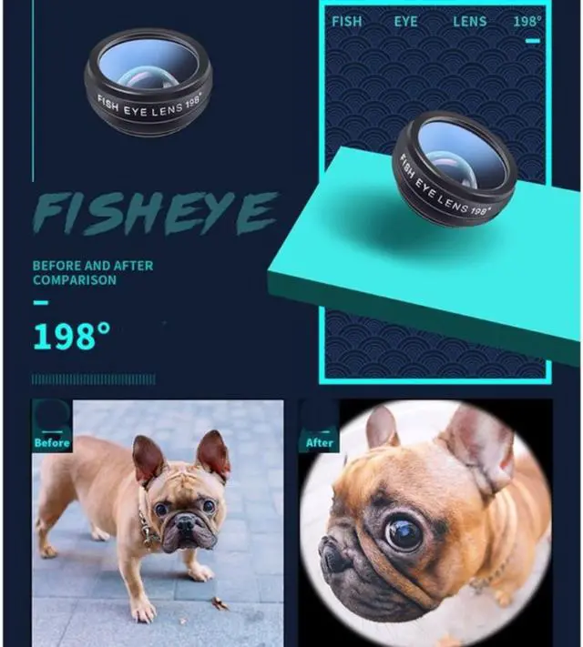 Phone Camera Lens- Kit includes 0.63X wide lens- & 15X macro-, 2X telephoto lens-,198° fish eye- lens-,kaleidoscope lens-,CPL- filter,flow filter-,radial- filter and star filter.