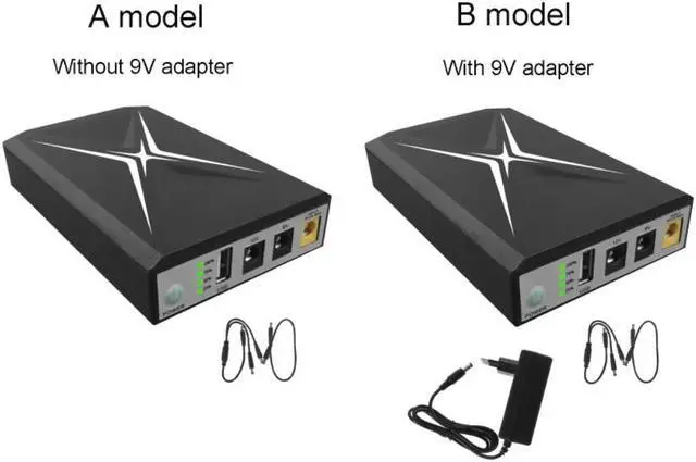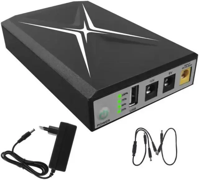 Mini uninterruptible power supply back up pack can power for most USB 5V2A or 5.5x2.5mm 9V1A 12V1A equipment.