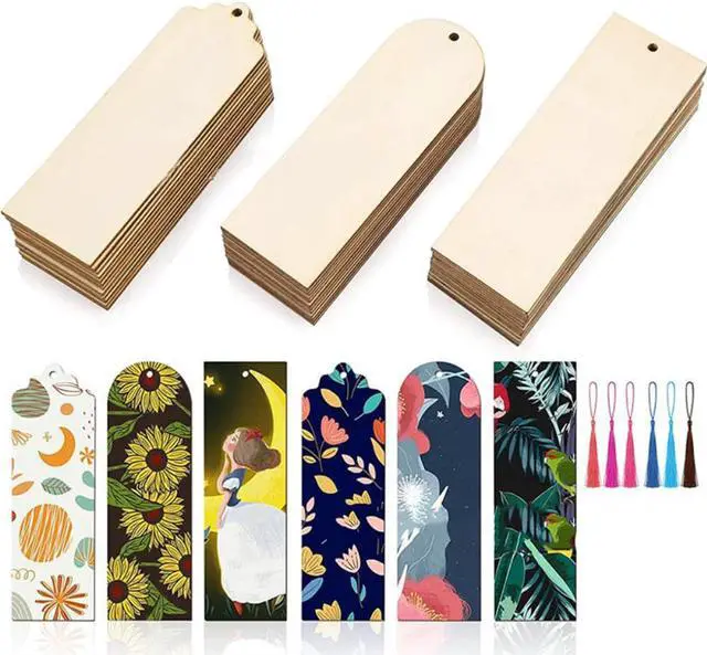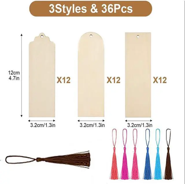36Pcs 3 Styles Wood Bookmark Bulk Blank Bookmarks with 36 Pieces 6 Colors Tassels for Christmas DIY Wedding Projects
