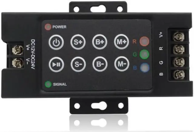 The LED colorful controller adopts advanced PWM controller technology to control various constant voltage LED lamps that can realize RGB color change, such as rgbled lamp strip, LD module, LED lamp string, etc. the current belongs to DC low-voltage input mode, and the output load is four interfaces, of which V + is the fair pole interface, The other three are RGB controller interfaces. RF radio frequency remote control and film keys are used for mode selection and adjustment to achieve static, jump, gradient, stroboscopic and other lighting change effects. At the same time, customers can adjust the brightness of static colors according to actual needs, adjust the speed of dynamic changes, and expand the power with our RGB signal amplifier, To achieve more synchronous changes of LED lights, theoretically, countless RGB amplifiers can be linked. This product can bring 12v30 lamp, 20m lamp for one meter, 10m lamp for 12V 60 lamp for one meter. The wireless remote control has the characteristics of long distance, no directionality, and can penetrate certain thickness obstacles. It has power-off memory storage function, 25 modes, 7 static colors and 18 dynamic changes.