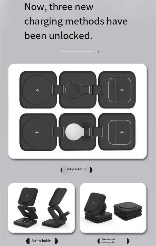 3-in-1 Fast Charging Charges phone + watch + earbuds at the same time.