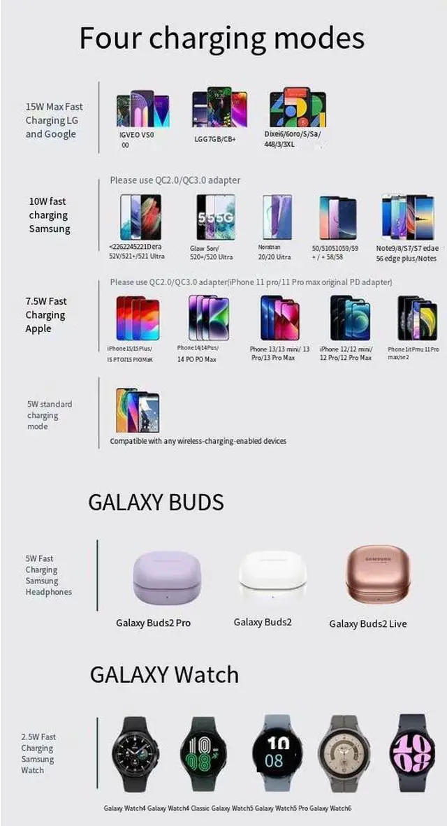 15W Max Output (Phone) + 5W (Earbuds) + 2.5W (Watch) Optimized for fast, efficient charging.