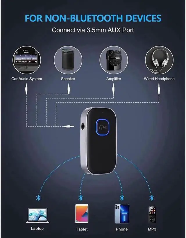 Enjoy Wireless Streaming MusicThis car Bluetooth adapter can be connected to non-Bluetooth car audio systems, home stereos, speakers, wired headphones via the 3.5 mm AUX adapter; And equipped with a Bluetooth 5.0 chip for stable connection / fast transmission / wide signal range. Just pair it with your phone and start listening to your favorite music!
