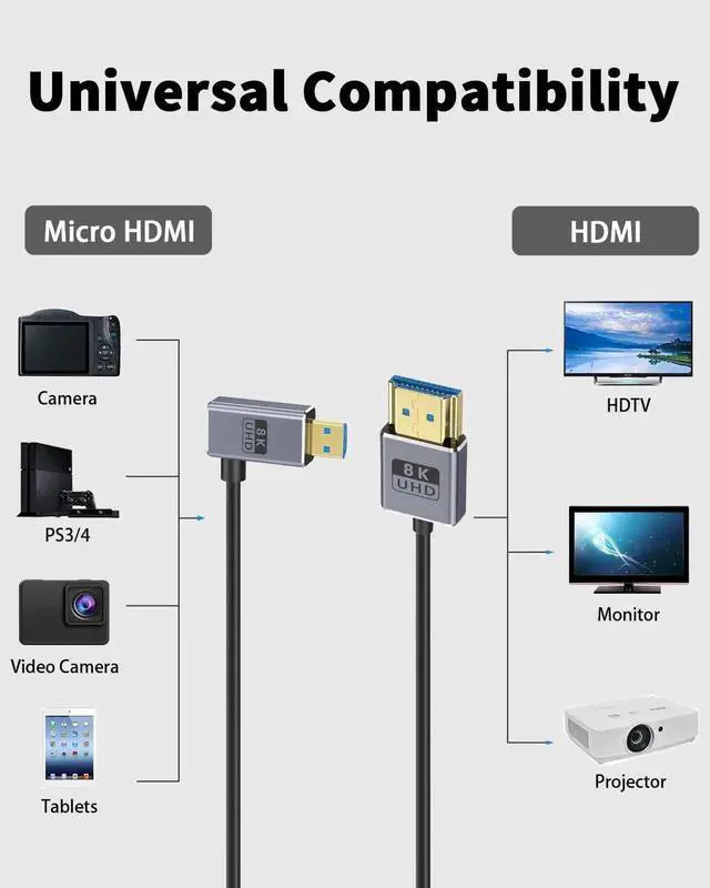 Ultra-Thin Micro HDMI Cable: This ultra-thin HDMI 2.1 cable features a 2.5 mm diameter and a shielded core of only 1.87 mm, making it easy to bend and highly adaptable to devices. It is more environmentally friendly, offers higher elasticity, and is less prone to tangling and breakage. Our coaxial cable is "thinner, softer, and easier to store" while providing "ultra-stable, " "ultra-high-definition, " and "ultra-fast" performance.
