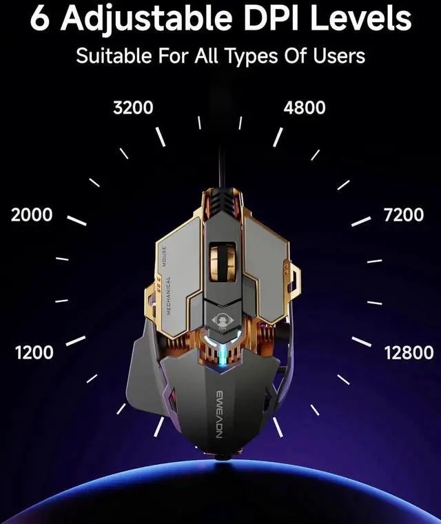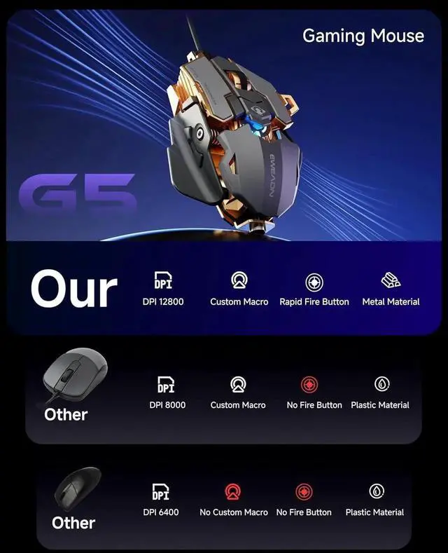 6-Level Adjustable DPI: The G5 computer mouse features up to 12,800 DPI with 6 adjustable levels and an ultra-fast report rate (1251000Hz), meeting your multiple needs, either for daily work or gaming. Dedicated demand for DPI options between 2000-12800 is available to be processed by software.