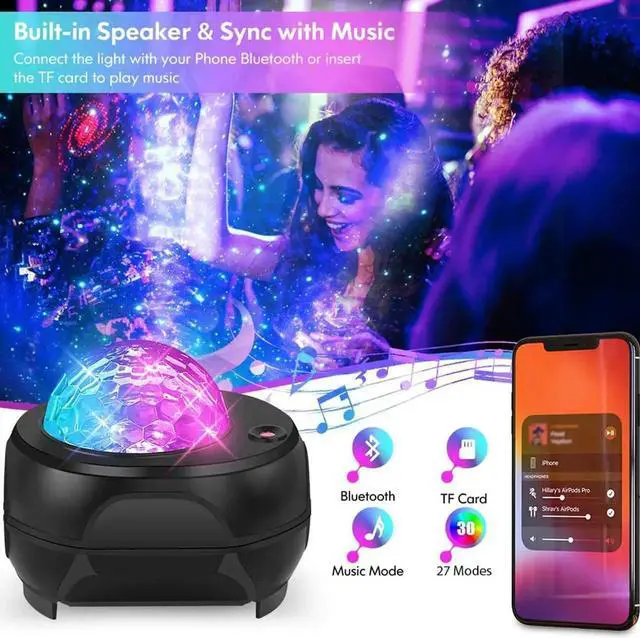 Adopt the advanced technic, the night light projector will sync with the rhythm of music beats or voice. It would be a fantastic experience with your family and friends dancing together under the space with sky projector light filled.