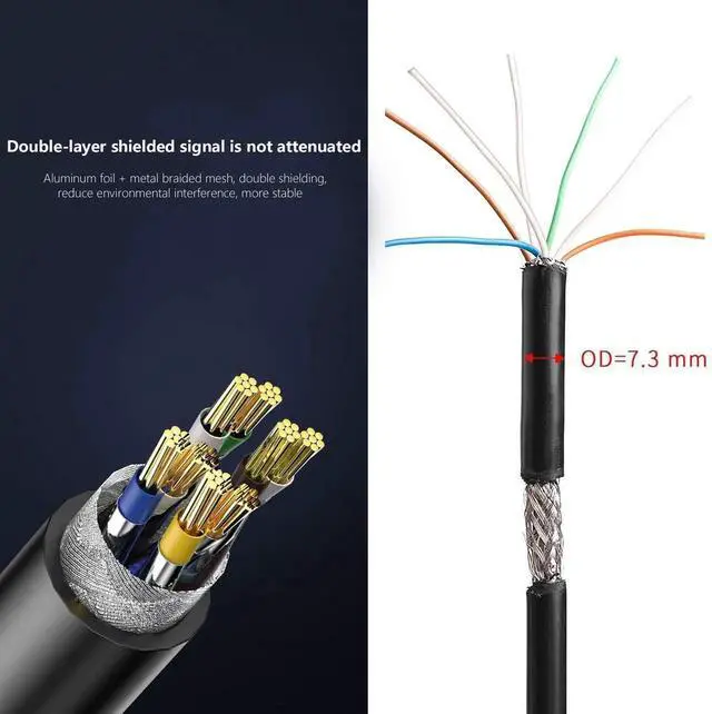 Twisted copper pairs are individually wrapped in Mylar-backed Aluminum foil, with a 70% Aluminum braid. Dual-shielding eliminates crosstalk & EMI better than Cat6. 26AWG, OD7.3mm, heavy-duty round ethernet cable suitable for outdoor and indoor use.