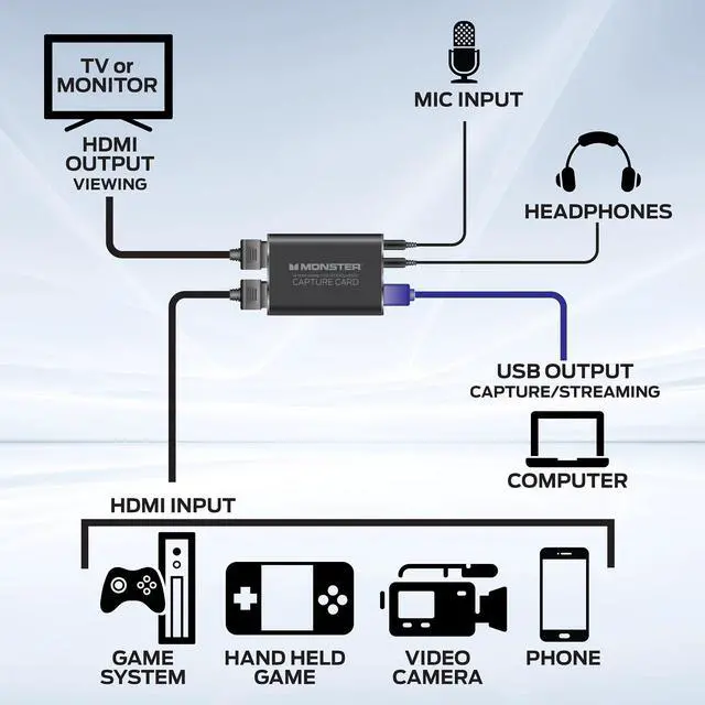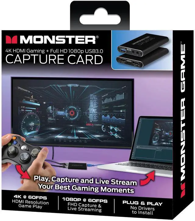 Plug in and go live with the Monster HDMI Capture Card, designed to help you easily stream, record, and share your gameplay or presentations in stunning detail. Whether you're teaching, gaming, or presenting, this video capture card delivers smooth HD video and crisp audio to keep your audience engaged.