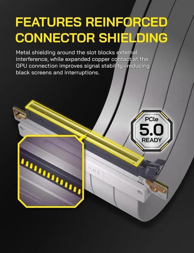 [ REINFORCED METAL SLOT & PRECISION COPPER CONTACTS ]Metal shell blocks external interference, while tight tolerance copper pins lock in rock-solid connectionseven under heavy GPUseliminating intermittent signal drop-outs