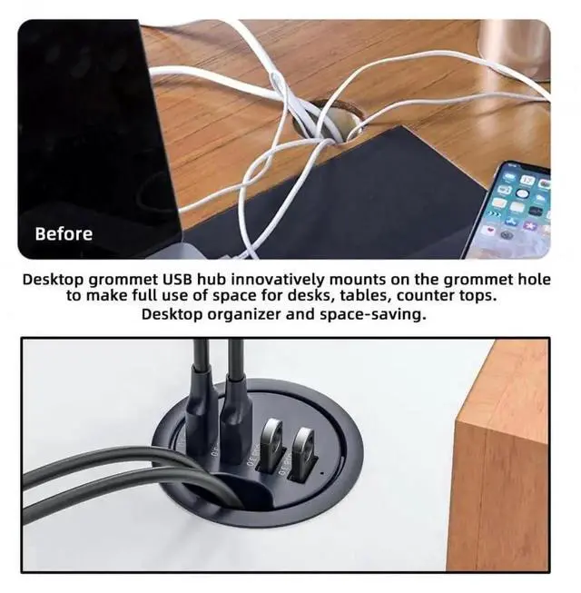 1) Desk Grommet USB Hub: Designed for an easy access to the ports of a PC on your desktop. You can mount the usb hub on the grommet hole, to make full use of space for desks. Desktop grommet USB hub innovatively mounts on the grommet hole,to make full use of space for desks, tables, counter tops. Desktop organizer and space-saving