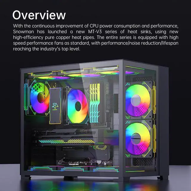 With the continuous improvement of CPU power consumption andperformance, Snowman has launched a new MT-V3 series of heatsinks, using new high-efficiency pure copper heat pipes. The entireseries is equipped with high speed performance fans as standard,with performance/noise reduction/lifespan reaching the industry'stop level.