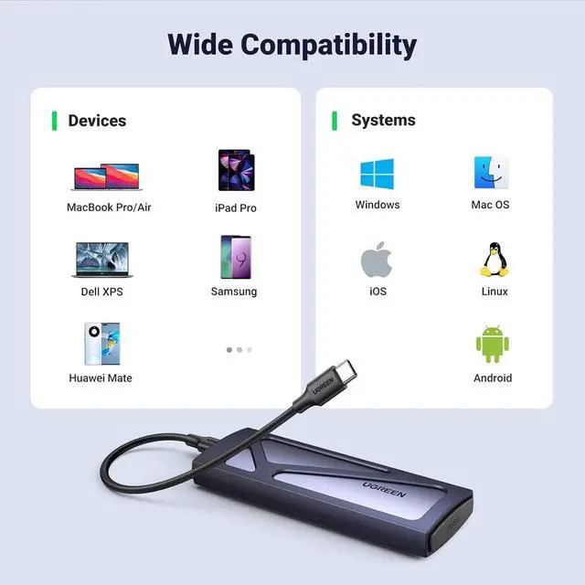 Broad Compatibility: The UGREEN M.2 NVMe SSD enclosure is specially designed to support NMVe protocol M/B&M keys and for 2230/ 2242/ 2260/2280 size SSDs up to 8TB. The M.2 NVMe enclosure is applicable for Windows, Mac OS, Linux, Android, IOS systems.(Does not support SATA NGFF SSD or mSATA SSD)
