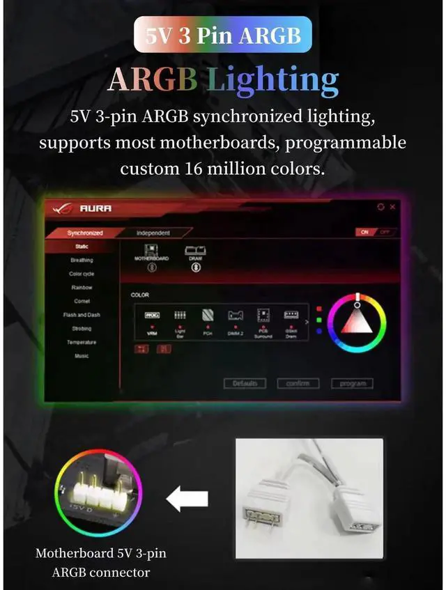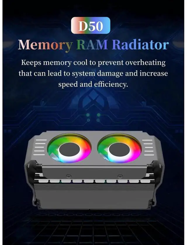 Noise and Lighting: The memory cooler adopts a low noise design, has good shock absorption effect and improves user comfort. 5V 3 pin ARGB synchronous light effect, supports most motherboards, and can be programmed to customize 16 million colors.