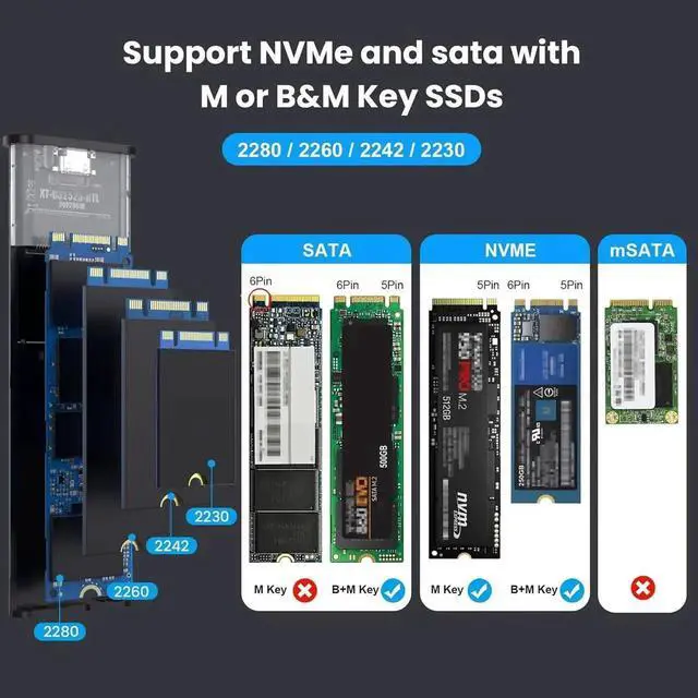 Attention: It supports PCI-E-based M key / (B&M) key M.2 NVME SSD read/write speed up to 10Gbps and SATA-based B&M Key M.2 SSD read/write speed up to 6bps. It is not compatible with B Key Connectors. It does not support M.2 PCIe AHCI SSDs, M.2 PCIe devices such as WiFi and capture cards, mSATA SSDs, and non-M.2 form factor SSDs.