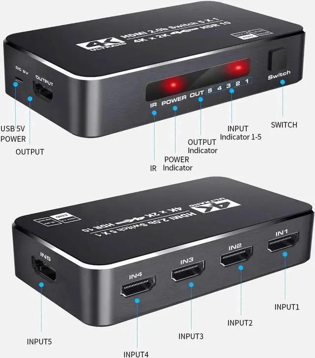 - 5 Input 1 Output HDMI Switch: Easily switch 5 HDMI sources to a single HDMI output by a local select button or IR remote control.